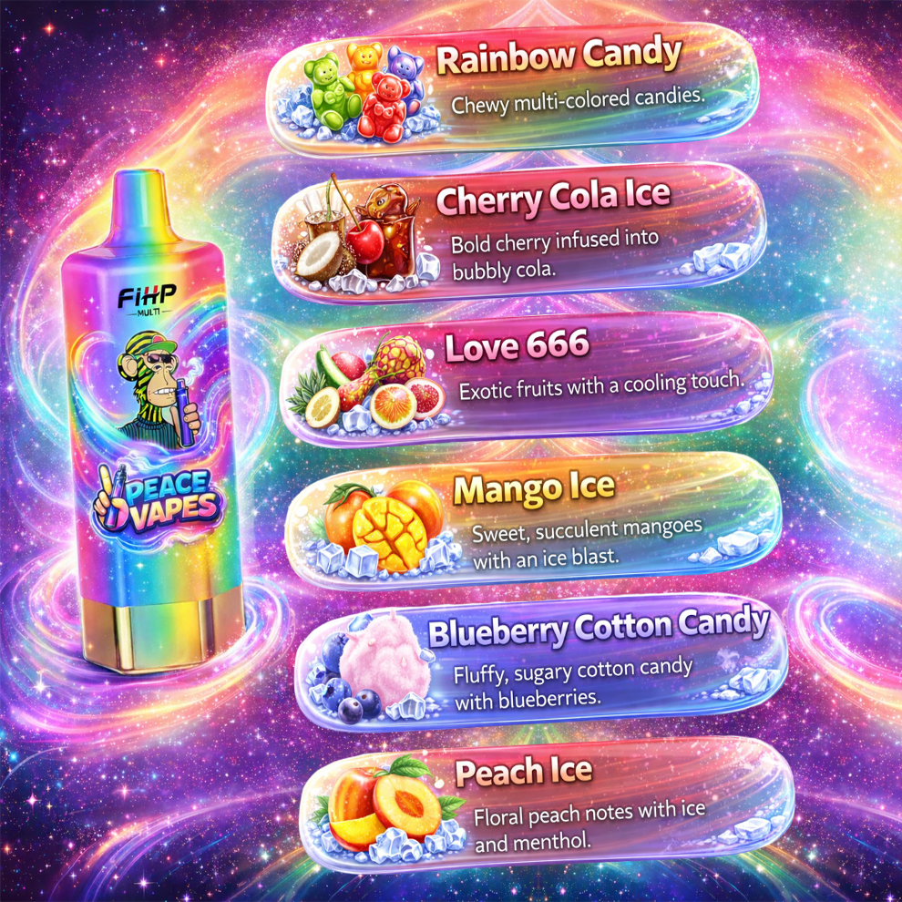 - Peach Ice: Floral peach notes with ice and menthol.